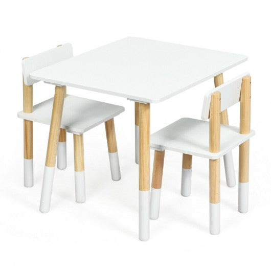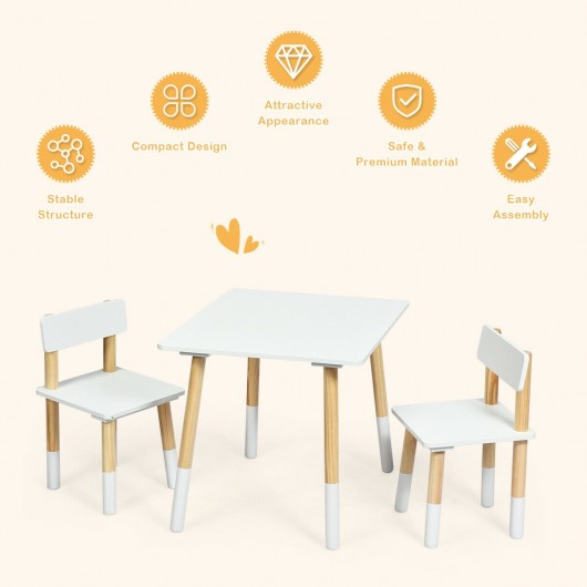 This kids table and chair set is aimed to caring for their pure childishness! This table and 2 chair set is a perfect activity center for toddlers to enjoy reading playing eating creating etc. Made of superior pine wood and MDF this table chair set provides strong support and durability. Safe rounded corners protect children's skin. The cute appearance attract kids to enhance hand-on skills and unleash imagination. Your little angel can play games with friends to deepen their friendship. If you are looking for this product don't hesitate to place an order! Comes with 1 table and 2 chairs Natural solid pine wood legs to ensure stability and durability MDF board with sturdiness and wear-resistance Ideal for kids to eat learn play rest and more Lightweight for easy transportation Perfect gift for kids aged 3-7 years old Suitable for children's room playroom nursery etc Smooth surface for easy cleaning Safe rounded corners avoid children injury Ergonomic backrest to offer a comfortable sitting feeling Antiskid foot pads to protect the floor from scratches Easy to assemble with built-in screws