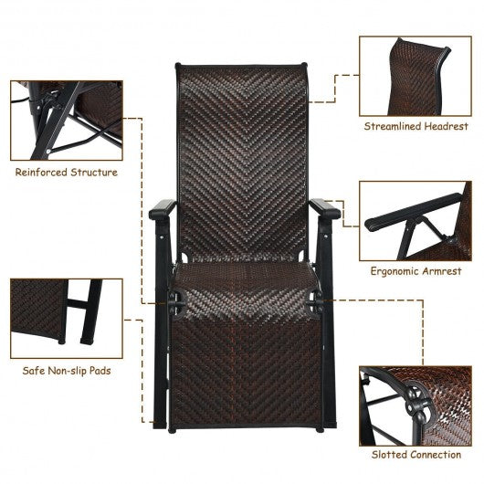 This outstanding chaise lounge is a good choice for you to have a wonderful afternoon and outdoor time. Made of high-quality PE rattan and solid steel frame this reclining chair is durable and sturdy enough for all year-round use. Meanwhile the comfortable recliner with ergonomic backrest can be adjusted in different angles to meet your personalized needs. You can quickly and simply adjust it through the armrests. More anti-slip pads design enhances the stability and prevents the sliding. The foldable and lightweight design makes it easy to move and carry to patio balcony office or garden. You can relax yourself on this breathable lounge chair. If you are looking for a recliner like this do not miss it! Made of superior PE rattan durable and weather-resistant Solid steel frame and thickened bracket ensure the good load capacity Adjustable position to meet your different requirements Foldable design makes it move and store effortlessly Classic design add unique charm to indoor or outside space Ideal for patio beach balcony office backyard etc Anti-slip pads prevent the floor from being scratched The smooth and flat surface is easy to clean No assembly required