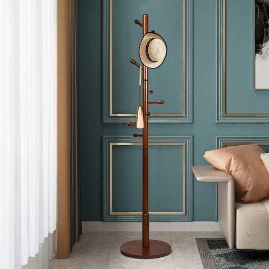 Wooden Coat Rack Stand Entryway Hall Tree 2 Adjustable Height w/ 10 Hooks-Brown