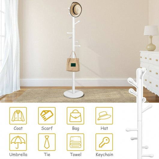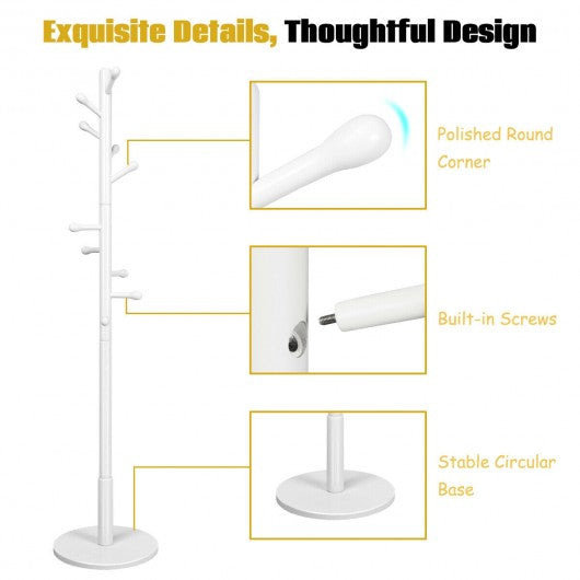 Wooden Coat Rack Stand Entryway Hall Tree 2 Adjustable Height w/ 10 Hooks-White