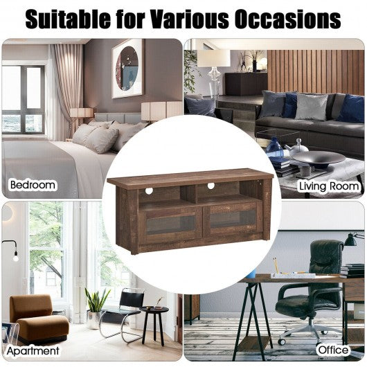 This TV stand adds a special touch of glamour to your home! High-quality engineered wood ensures a sturdy and stable structure. Spacious desktop can accommodate almost any TV up to 55". The TV stand is designed with 2 open shelves and 2 door cabinets which provide ample space to put cable box DVD player tapes magazines etc. 2 wire management holes in the back can prevent clutter. Its classic and elegant appearance is suitable for living room bedroom recreation room and so on. Do not hesitate to buy it! Made of premium engineered wood to ensure sturdiness and durability 2 open shelves to classify your items and keep everything organized 2 cabinets with tempered glass doors to store books CDs gaming consoles and other items Large tabletop to place TV up to 55" Non-slip foot pads to prevent the floor from being scratching Back holes to organize messy wires Simple and classic look to integrate into your bedroom living room office etc Natural wood grain to add a charming touch Max weight capacity of the tabletop can reach 135 lbs Smooth surface for easy cleaning Easy to install under the detailed instruction