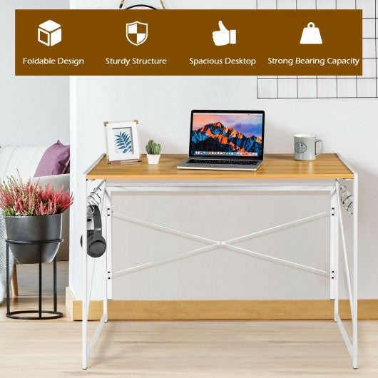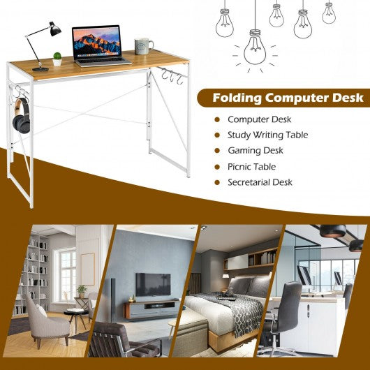 Folding Computer Desk Writing Study Desk Home Office with 6 Hooks-Natural