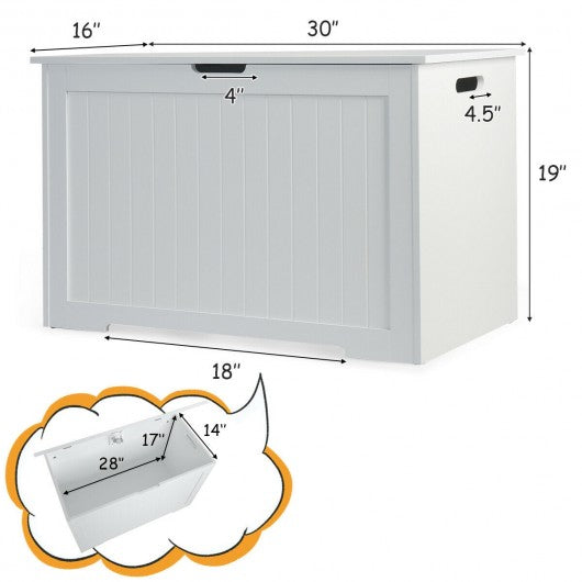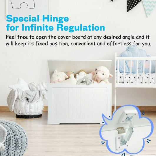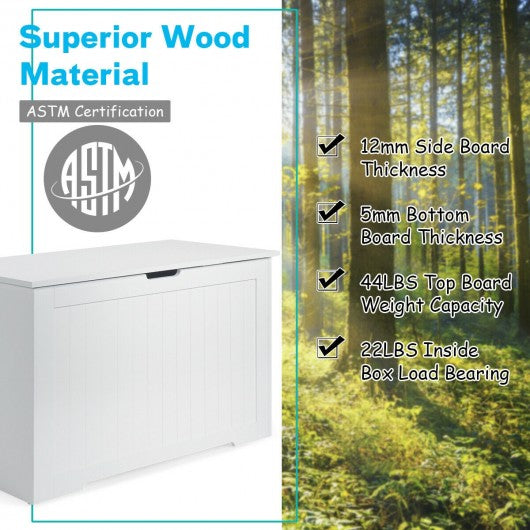 With 44 lbs bearing capacity this toy box can basically hold all the children's toys to make the room tidier. It is carefully designed with a groove at the front edge to prevent fingers from being pinched. 2 holes on the sides make it easy to lift the box and move it to the place needed. The flip-top lid provides convenient opening for taking out or putting in items saving your energy. It is high-quality made of durable and safe MDF material for long service life. The elegant appearance effortlessly coordinates with your existing home d�cor and is suitable for entryways bedrooms playrooms etc. Are you tired of organizing your kid's toys? Then it is time for you to buy this toy box! Large storage space for all kinds of items like dolls blankets or books Non-toxic and odorless MDF material is safe for family use Durable box with the high bearing capacity of 22 lbs for interior and 44 lbs for the top panel Flip-top lid design facilitates taking out or putting back items Strong support hinge prevents the lid from falling off Smooth and waterproof surface makes it easy to clean Groove at front edge for finger-pinch prevention 2 holes on sides for easy movement ASTM certification ensures high quality and user�s safety Easy to assemble according to the instructions Wide application for bedroom living room or kin