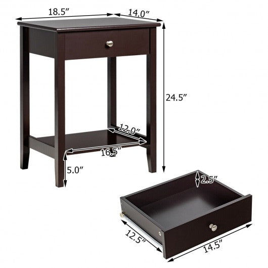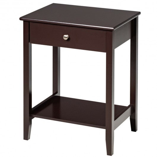 This 2-tier nightstand will free your life from mess and disorder! This compact bedside table is multi-functional that you can place it in bedroom living room entryway and some small places. With a spacious table top drawer and open shelf it can provide ample storage space for daily essentials making your room tidy and neat. Smooth slides and tiny handle of this table are designed for convenient use. Combined with stylish appearance and great practicality the side table is a great addition to your home. As for the quality made of premium MDF board with NC paint this simple yet solid table allows you to use it for a long time. Moreover 4 solid pine wood legs enhance stability without any wobbliness. If you are looking for a product like this don't hesitate to buy one. Includes a spacious tabletop pull-out drawer and bottom storage shelf Sturdy MDF frame with solid wood legs ensure durability and stability Compact and simple design saves space and fits well to any home decor Easy to keep your phone facial tissue glass or bedside readings at hands Round metal handle and smooth slide rails for easy pulling out Smooth lacquered surface for easy cleaning and maintaining A drawer provides large space to keep your private sundries Perfect for bedrooms living room entryway and some small space Easy to assemble with detailed instruction