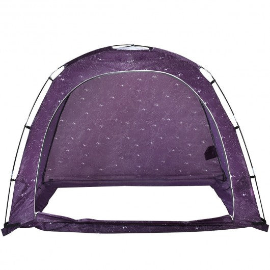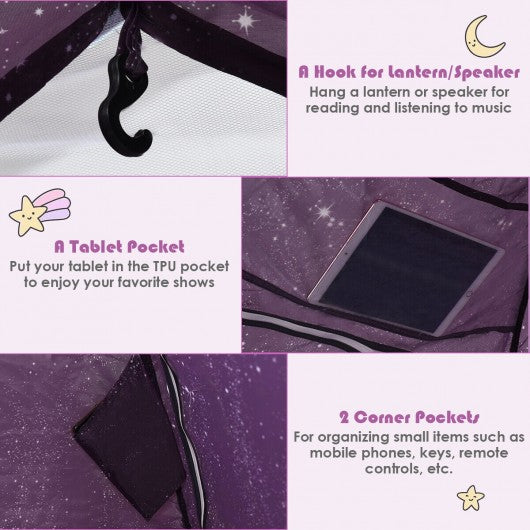This is a brand new bed tent which will provide you with a warm and comfortable private space! Made of tear resistant polyester fabric and supported by sturdy fiberglass poles this indoor tent is not easy to crack or deform and can withstand long-term use.During the day it can be used as a recreational tent. The transparent TPU bag can hold your tablet to play your favorite TV shows. Two corner pockets can be used to store small items such as mobile phones and remote controls. You can also play music by hanging the speaker on the top hook.At night it will provide you with a warm sleeping environment and the air vent on the top of the tent can promote the circulation of fresh air. When not in use it can be folded easily and for storage and carrying. Do not hesitate to buy it! Made of high-quality and tear-resistant polyester fabric to ensure long-term durability Sturdy fiberglass poles to maintain the shape of the tent without sagging Three doors with two-way double-sided zippers for easy access Mesh vents at the top to facilitate the circulation of fresh air inside the tent A TPU pocket for tablets and two corner pockets for phones keys and small items Comes with a hook that can be used to hang a lantern and a speaker Featuring a hook-and-loop strap at each corner to firmly fit your mattress Easy to assemble with simple structure and clear instructions Easy to fold and equipped with a carrying bag for convenient storage and transportation