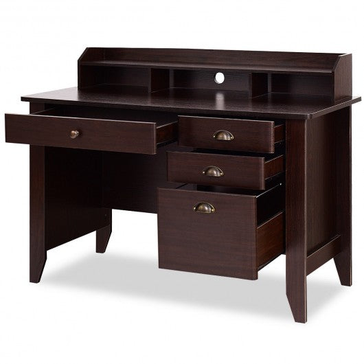 This computer desk is perfect furniture for your home or office and will provide you with an unmatched convenience. The table features a smooth slide-out long drawer and three spacious side drawers offering large storage space for your daily supplies. A desktop shelf provides more storage space for books photo frames or cups. Made of engineering MDF construction the computer desk provides years of sturdy and reliable use for you. Enjoy your writing with this practical and elegant desk. Buy yours today! Brand new and high quality Engineering MDF construction sturdy and durable Spacious workstation with a shelf A long drawer and three side drawers for large storage space Ideal for business or personal use Assembly required