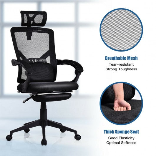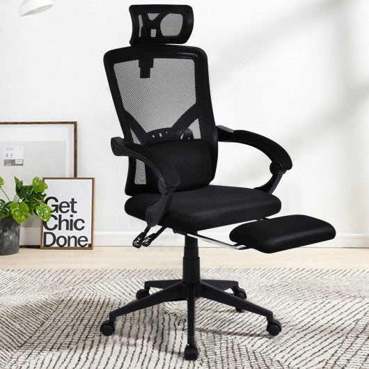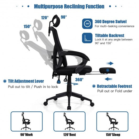This office chair is designed with tiltable backrest which allows you to find the best angle for working. Retractable footrest and adjustable headrest will give you more comfort and relaxation for long-time working. Furthermore the chair can be adjusted in height to meet the needs of different people. Ergonomic principle is reflected perfectly in its curved backrest padded armrest and lumbar support all contributing to an ultra-comfortable sitting experience. Soft cushion and breathable mesh cover avoid stuffy feeling s especially in a hot season. What's more 360�swivel seat and smooth-rolling casters brings you much convenience. What a great complement to both home and office! If you are looking for a product like this. Don't hesitate to buy it! Tiltable backrest from 90� to 150� for the desired angle Adjustable seat height to meet different needs 360-degree swivel seat and 5 universal wheels for multi-tasking convenience Elastic and soft sponge cushion to offer a comfortable sitting feeling Breathable mesh fabric makes you feel cool even if sitting for a long time The headrest can be rotated 45� and adjusted in height for good support Adjustable curved backrest padded armrest and lumbar support for added comfort and relaxation Retractable footrest to rest your legs Comes with a lumbar pillow to relieve waist fatigue Max weight capacity can reach to 265 lbs Five-claws design to disperse the pressure for good stability Easy to assemble under the clear instruction