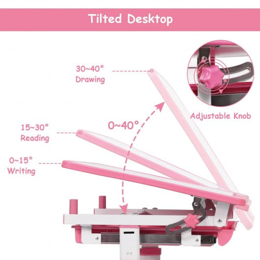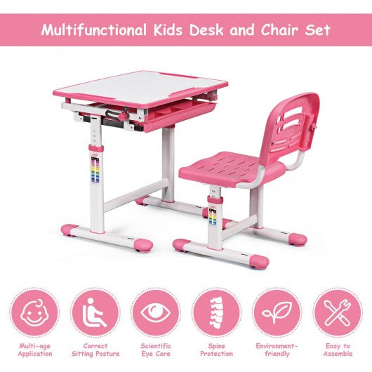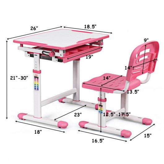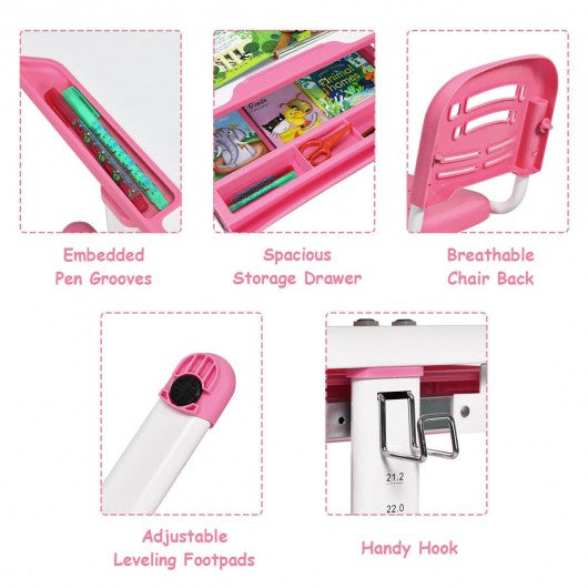 The kid's desk and chair set is your child's ideal learning partner! The height of the desk and chair is adjustable which helps kids have a perfect sitting posture. And the desktop of student desk can be tilted from 0-40�angle to protect their eyesight. What's more the desk features an embedded pull-out drawer for storing pens books papers and other little things to reduce clutter. The multifunctional study desk and chair set combines practicality and fun. It is really a perfect gift for your child. Don't hesitate to buy one! Height adjustment lets desk and chair grow with kids Adjustable backrest gives kids a comfortable sitting experience Tilted desktop provides better angle for writing reading and drawing Anti-pinch design protects fingers from harm Anti-fall stopper prevents materials falling while the desktop inclined Environment-friendly MDF desktop for safe use Made of solid steel frame to ensure stability and durability Spacious drawer under the desktop stores books paper and other school supplies Embedded grooves hold pens and pencils to reduce clutter Handy hook for hanging backpack Leveling footpads can be adjusted Easy to assemble