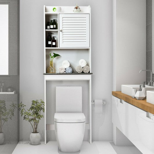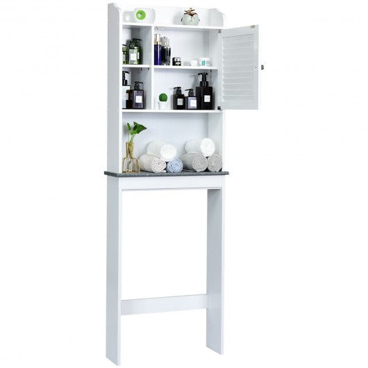 Made of P2 MDF with the moisture-proof paint this over the toilet space saver is particularly suitable for the wet environment for all your bathroom storage needs. This upgraded toilet rack is durable and stable. It features cubbyhole storage with an adjustable shelf two long shelves and a louver door ideal for a wide variety of toiletries medicines and more. With this toilet rack your bathroom will be tidier and cleaner. If you are looking for a toilet space saver don't hesitate to buy this one! Healthy & environmental-friendly materials non-toxic and odorless Moisture-proof coated surface easy to clean and keep stable Maximized your bathroom space with an open shelf and a door cabinet Adjustable shelf behind the door with 5 heights allows you to change height as your needs High-quality MDF panels are sturdy and durable for long use time Compatible specification suitable for most standard bathroom Simple installation detailed instruction & accurate hardware Large storage space for storing things such as bath essentials towels Modern & elegant appearance white paint smooth panels and a black paint faux marble panel