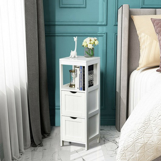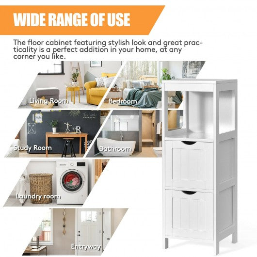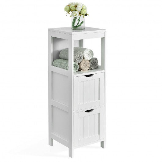 The 2 roomy drawers of this floor cabinet are sure to fulfill your storage requirement of toilet essentials. Their position can be changed easily as per your preference. Grooved handles bring much more convenience in pulling and pushing the drawer. Besides deep storage drawers it has an open shelf to help you store your frequently-used items for easy access or display beautiful ornaments for home decoration. It is designed with an anti-tilt screw which keeps the cabinet ultra-stable and getting rid of tipping danger. You can place it in any corner of your house from the kitchen to the living room not only in the bathroom. If you are looking for a floor cabinet like this. do not hesitate to place an order! 2 removable drawers can be placed on any shelf for variable storage requirement The grooved handle makes it convenient to pull and push the drawer Top shelf and open shelf provide perfect storage space for easy access Sturdy freestanding structure with great stability and high weight-bearing capacity Anti-tilt screw on the back of the cabinet for enhanced stability Take up less floor cabinet ideal for small spaces Footpads at the bottom protect your floor from being scratched Timeless pure white color simple elegant design work well with different home décor Can be used as a display cabinet in the corner or a storage cabinet in the bathroom bedroom etc