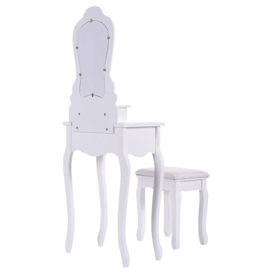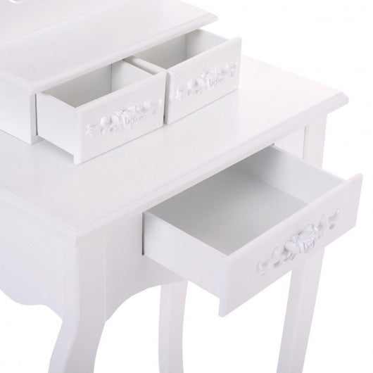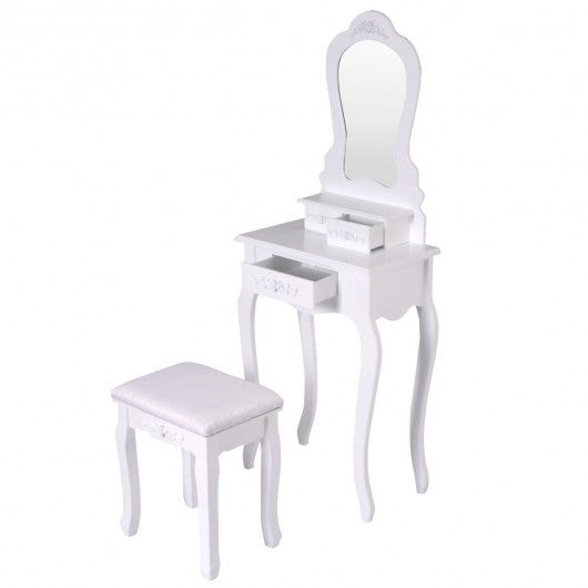 p>This is an exquisite table with elegant and luxurious design of a well-crafted carving which adds a gratifying vibe into your home. The natural white wood used in the table and stool will easily match your home decor. Makeup and cosmetics will be neatly organized in this three-drawer table. The hard and durable MDF material and wooden legs provides a long-lasting piece of furniture. The removable mirror makes it easy to transform this makeup table into a writing desk. What are you waiting for? Trust us it's worth buying! Exquisite and fine craftsmanship 100% wooden legs plus durable MDF makes it sturdy and durable The vanity table is elegant and clean-lined 3 drawers providing enough space for storing your accessories Drawers with flower patter handle for convenient opening and closing A beautiful fan-shape mirror so you can apply your makeup with ease Spacious tabletop which can be used as an office table or a nightstand Curved pinewood legs provide a strong support system to the table and stool The simple and elegant design makes this set feel fresh and natural while blending in with the current decoration of your home A matching cushioned stool provided The height of the stool perfectly matches the hight of the table and the mirror All hardware parts of the set are included in the package making the installation simple and easy