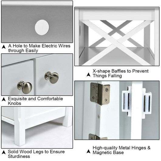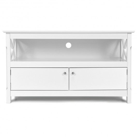 This practical contemporary-style TV stand will suit your media and storage needs. Made of finely select wood this TV stand with wire hole is sturdy and durable built for reliable lifelong use. The 2 cupboards and display shelves provide a large space for placing TV remotes books magazines photo albums or other items you need at hand or want as attractive decoration. As well there is a hidden hole in the back board so you can thread the wires of your many devices in an out of the way fashion that keeps your environment orderly and attractive. Featuring a bright white finish and X-shape wooden panels on both sides bring a modern style to your living room with this TV stand that blends with any home decor. This cabinet can be used in your living room bedroom kitchen or bathroom to help you to satisfy storage needs throughout your home. The unit is easy to quickly assemble. If you are looking for it don�t hesitate to buy it. Spacious storage space with open shelf and two cupboards Hidden hole at rear provides easy and attractive wire threading Ergonomic knobs for easy opening and closing exquisitely selected to fit home decor X-shape panels keep contents in place Keep house hold items and media devices in order Suitable for living room kitchen bedroom or bathroom Assemble easily and quickly by yourself