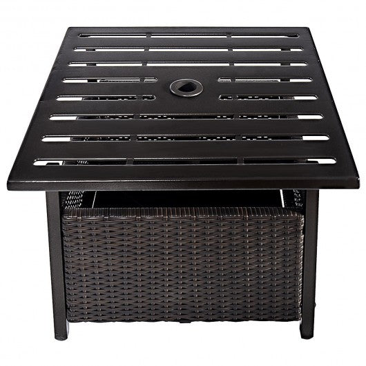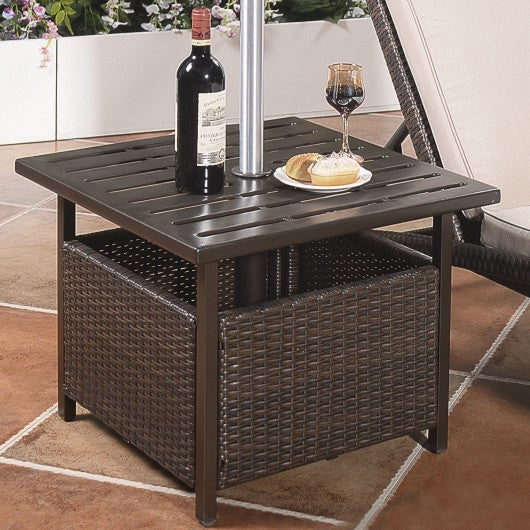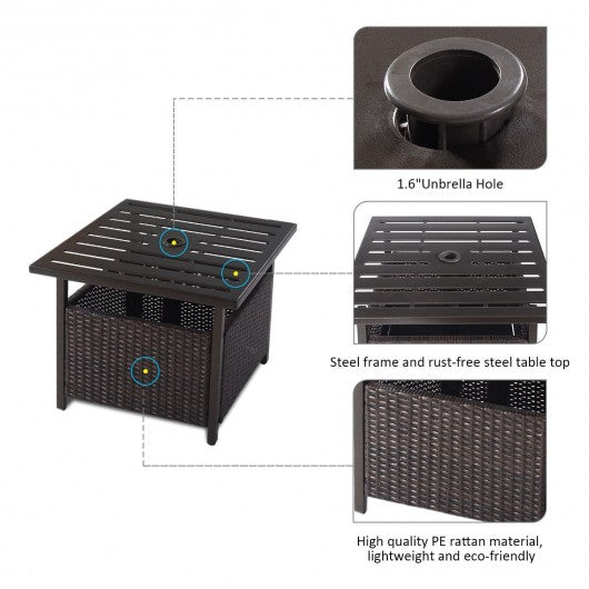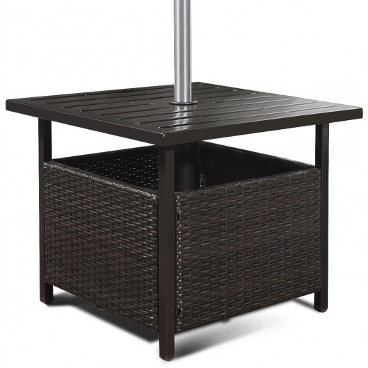 This brown rattan side table with a reserved umbrella hole is perfect for outdoor space such as patios gardens backyards pool sides etc. Also it's curved and polished feet make it suitable to be used indoors. Made of steel it's sturdy with a strong bearing capacity. There is a storage space under the tabletop. It can be used to store sandbags to increase the stability of the table. It also can be used to store other household items when used indoors. It will be a great addition to your living space. Add this convenient and useful patio umbrella stand to your furniture set now! Features a sturdy and anti-rust frame made of powder-coated steel Strong bearing capacity of up to 110 lbs A reserved umbrella hole on the tabletop designed to hold umbrella poles with a diameter of up to 1.5 inches Storage under the tabletop consists of premium artificial PE wicker and steel bottom Premium PE rattan can cope with all weather conditions 4 polished and curve designed feet to keep the floor from getting scratched and the table from slipping 23 lbs in weight easy for moving and relocating without help Easy to clean with a feather duster or a wet towel