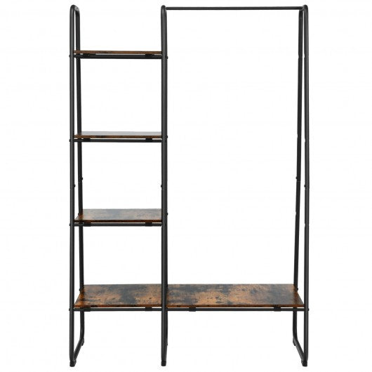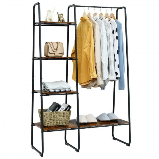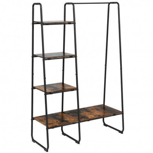 This metal garment rack with 5 shelves and 1 hanging rod is a good choice for you. Made of sturdy painted metal tubes and premium MDF board the storage organizer is stable and durable enough to be used for a long time. With large storage space the organizer can store your daily clothes shoes bags and long garments. This multifunctional garment rack can be used in various places according to your different needs. By following the detailed instruction the rack can be assembled in a short time without difficulty. If you are looking for such a product don't hesitate to buy it! 4 small shelves and 1 big shelf for placing bags shoes storage boxes and so on Cloth hanging rod for storing long garments and clothes that wrinkle easily Heavy-duty triangular metal frame ensures stability and durable Solid MDF board is durable and sturdy for high bearing capacity Compact design can be placed in the corner for space-saving Industrial appearance is suitable for different decoration styles in your home Waterproof materials for conveniently cleaning Easy to assemble with required accessories