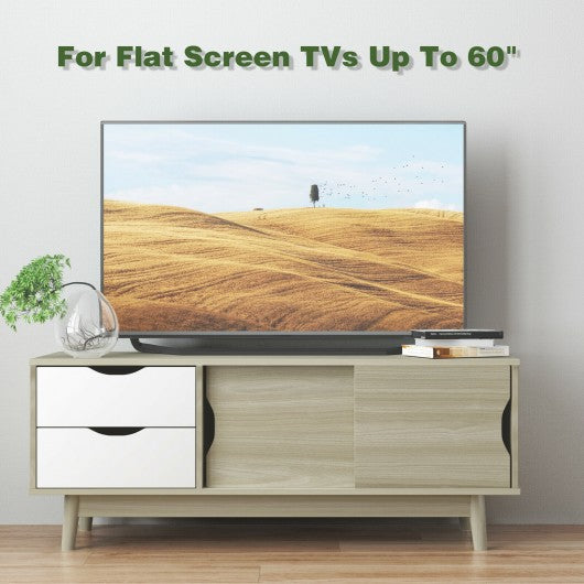 This accent 47.5" TV stand with large storage space is the perfect piece to give your living space a charming addition. Thick tabletop features superior durability and resistance plus solid rubber legs ensure stability and great load capacity. Equipped with 2 sliding drawers and one large storage cabinet this TV stand removes visual clutter. Besides the rear cable management hole can tidy the messy wire. The spacious tabletop fits flat screen TVs up to 60" and can also be a display place to put paintings vases and plants. This stylish TV storage stand can be put in the living room bedroom lounge etc. Come to take one and you can sit with your family in front of the TV stand to enjoy the leisure time together. Fits TVs up to 60" flat screen and load up to 88lbs 2 large drawers and storage cabinet with sliding doors Solid wood legs for stability and thick tabletop for durability Rear cable management hole decreases the messy of wire Clean lines and elegant design provide attractiveness Smooth surface makes daily maintenance easy to do It is easy to assemble following the clear instruction