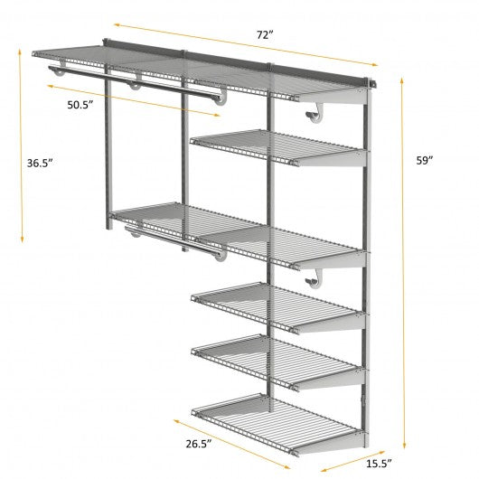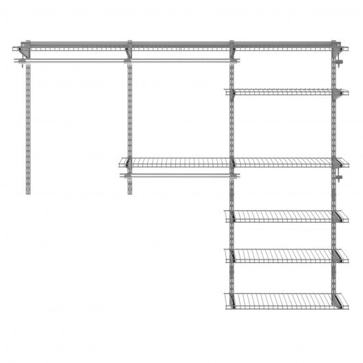 Make the most of your closet space with the adjustable and customizable configurations custom closet kit. These organizers fit closets range from 4ft to 6 ft wide and allows for adjustable shelves so that you can customize to perfection including 3 sturdy hanging rods a 5-shelf expanding cubby unit and 4 open shelves provide 75" hanging space and 230" shelving space with full adjustable height. The wire shelves are coated to safeguard against rust or chipping. All necessary hardware and a step-by-step template are included for easy installation. Moreover you can maximize your storage space by adding other configuration accessories such as wire baskets Telescopic trousers rack and more. If you are looking for a product like this. Don't hesitate to buy it! Simple and economical solution to organizing your closet Powder coated steel frame strong and rust-resistant Steel construction means optimal stability and no sag Ventilated wire mesh design promotes air circulation Free slide shelf and hang rod that allows ultimate convenience Offers long and short hanging space for different sized clothes Perfect for laundry rooms walk-in closets or basements Installs quickly and easily with the included mounting hardware