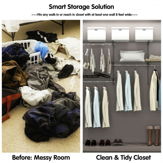 This fully customable closet storage kit is just what you need to make your bed room complete. It features a powder coated steel frame with clear compartments for a stylish look. Store your items out of sight in a durable and strong organizer complete with an all-steel rail and upright system to allow you easy access to all your favorite closet accessories. Moreover featuring 125" shelving space and 88" hanging space it gives you spacious storage space for suitcase thick quilt or clothes of different seasons. These organizers fit closets from 3 feet wide to 5 feet wide and allows for adjustable shelves so that you can customize to perfection. Add stylish and smart storage to stay organized with the custom closet configuration storage kit. If you are looking for a product like this. Don't hesitate to buy it! Simple and economical solution to organize your closet Powder coated steel frame durable and rust-resistant Steel frame for optimal stability and no chipping Ventilated wire mesh design prevent moisture Free slide shelf and hang rod for convenience Offers customable storage space for different sized items Perfect for any walk-in or reach-in closet Installs easily with included mounting hardware