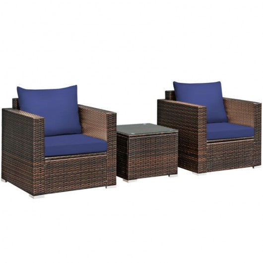 3 Pcs Patio Conversation Rattan Furniture Set with Cushion-Blue