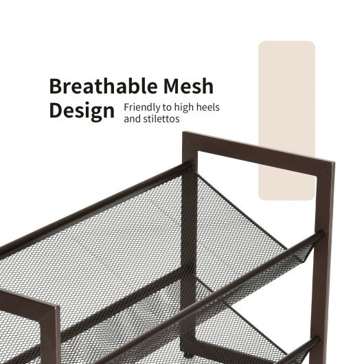 Keep your shoes organized and off the floor with our 4-tier shoe storage rack! The nicest thing about this shore storage organizer is that shelves can be installed angled or flat or even better a mixture of both not to mention it is easy to assemble and adjust. Mesh shelves are great for airflow and friendly to high heels and stilettos. Containing 4 layers and yet still compact enough to fit into your closet and other narrowed areas this shoe storage shelf can accommodate at least 16 pairs of shoes. The steel frame makes sure this neat shoe organizer is stable and durable in use. If you are looking for a shoe organizer stand like this do not hesitate to place an order! The shelves can be installed angled or flat based on your preference Several layers for maximizing shoe storage needs of slippers sneakers and so on Mesh shelf design is breathable and stuck-free even for high heels Compact shoe storage unit is suitable for small areas Contain at least 16 pairs of shoes Easy to assemble with detailed instruction Ideal for living room hallways foyer Multiple optional layers available in our store Load-bearing of each shelf is 11 lbs Simplicity inspired with aesthetic pleasing
