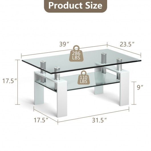 Specification: Color: White/ Black/ Nature/ Coffee Material: Tempered glass Stainless steel Iron Product dimension: 39" x 23.5" x 17.5" Product dimension of shelf: 31.5" x 17.5" x 9" Net weight: 45 lbs Maximum weight of tabletop: 286 lbs Maximum weight of shelf: 110 lbs Package includes: 1 X Glass coffee table