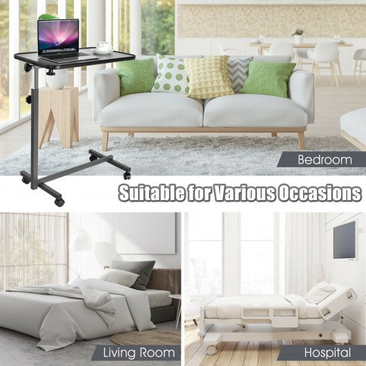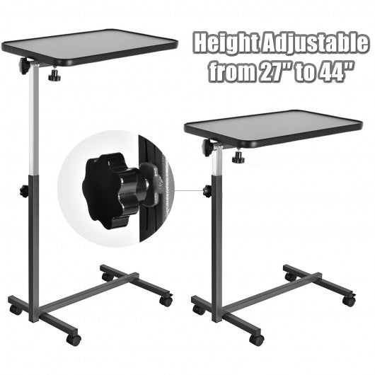 This over bed table is ideal for eating reading writing playing games or using your laptop while you're in bed. Thanks to the height adjustability the table fits over any bed for your comfort. Equipped with 4 swivel casters the table is easy to move around. In addition the tabletop can be tilted to various angles to meet your demands. Made of solid steel and MDF the table is strong and durable for years of use. The table top is smooth and easy to clean with a damp cloth. With this bedside table you can relax on your bed or lounge on your sofa and still get your work done. Don't hesitate to buy it! Brand new and high quality Table top lockable for security Table top can be tilted to various angles "H" shape steel base for security and stability Easy maneuverability with 4 swivel casters