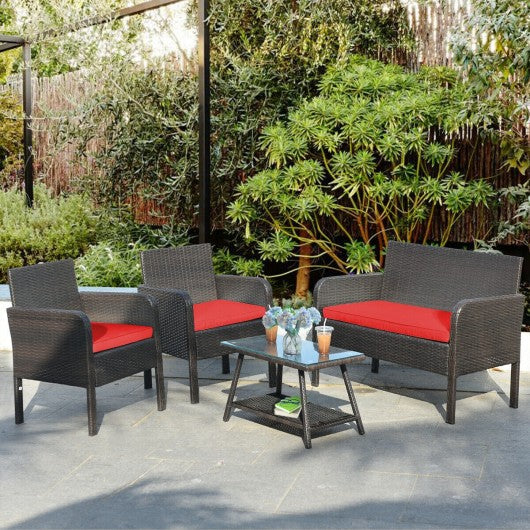 4Pcs Patio Rattan Wicker Furniture Set Conversation Sofa Bench Cushion-Red