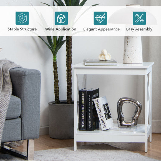 2-Tier Side Table with X-shape Design and 4 Solid Legs-White
