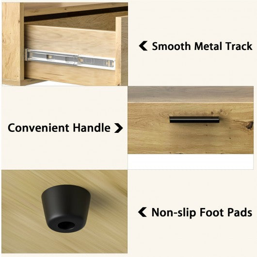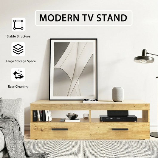 Coming with 2 large sliding-out drawers and an open storage shelf it is perfect for storing various items and getting them well organized in one place. The spacious desktop will fit the size of most flat-screen TVs up to 60 inches. Made of premium engineered wood this TV stand is solid and durable which will bring long-lasting reliable service to you. With modern style and unique design the TV cabinet perfectly coordinates with different home decorations. It is sure to add a special touch of glamour to the living room bedroom and more. If you are looking for a TV stand like this do not hesitate to place an order! The large tabletop can hold most flat-screen TVs up to 60 inch Premium engineered wood ensures sturdiness and durability 2 open compartments allow you to fetch items with ease 2 drawers provide storage space for books routers gaming equipment etc Convenient handle and metal track make it easy to pull out the drawers Non-slip foot pads protect the floor from scratches Modern style fits well with your bedroom living room and more A smooth surface is easy to clean and maintain