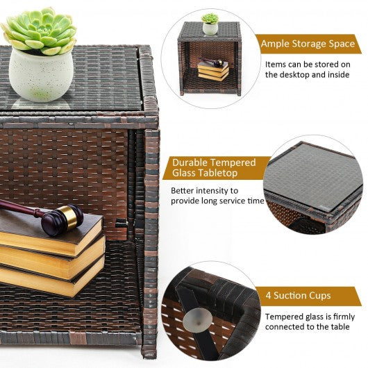 The high backrest and wide armrest provide the best support for your body and relieve fatigue effectively. Each rattan chair comes with a removable upholstered seat cushion as well which is easy to clean after enjoying the ultimate sitting experience. The bottom X-frame of the chair provides excellent load-bearing capacity for maximum support pounds. Other than that the toughened tempered glass table provides you with ample storage space through the desktop and internal storage compartments. Durable tempered glass tabletop and table frame are connected by 4 suction cups for better stability. If you are looking for a set of features like this do not hesitate to place an order! The curved high back and wide armrests support the body and relieve fatigue High-density sponge more comfortable sitting posture The seat cushion with a zipper for easy removal and cleaning Durable PE rattan easy to clean and weather-resistant Tempered glass coffee table adding convenience and durability The box-like design aims to bring plenty of storage space 3-piece PE rattan furniture set suitable for garden terrace poolside etc