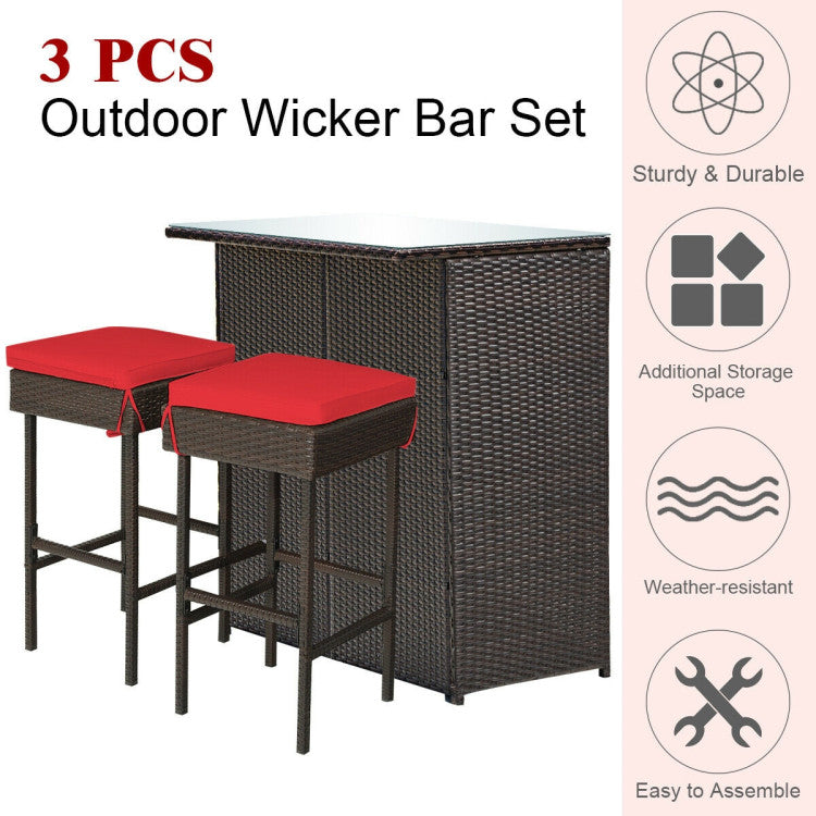 3PCS Patio Rattan Wicker Bar Table Stools Dining Set-Red