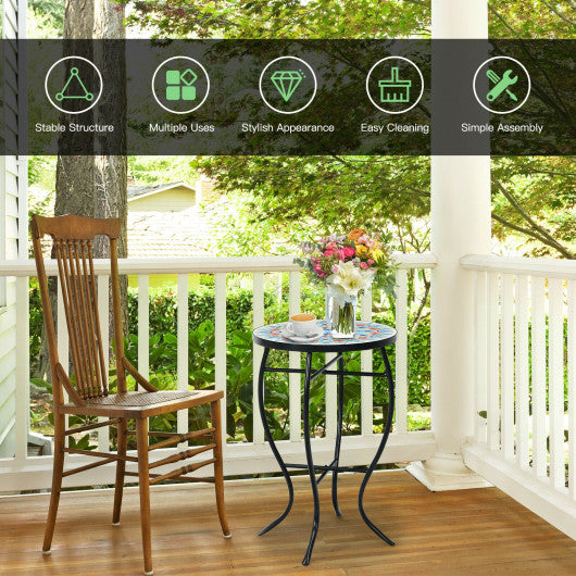 Are you looking for a versatile side table to keep your lovely plants and display decorations in organize? This mosaic side table will achieve all above and decorate your indoor & outdoor occasions as well. With an attractive mosaic pattern and classic ceramic tile top this side table is a charming complement to your home. Smart size makes it suitable for any place just by a swimming pool beside sofa or anywhere else. Strong steel frame and inclined legs ensure rugged structure for long service life. The table can be used as a plant stand a patio side table an outdoor coffee table. Moreover it creates a cozy area to enjoy leisure time when combined with a outdoor lounge chair. If you are looking for a versatile side table like this do not hesitate to place an order! Pretty mosaic pattern adds highlight to indoor and outdoor occasions Class ceramic tile top matches seamlessly with home decorations Used as a patio plant stand outdoor coffee table sofa side table etc Combined with existing garden seating to enjoy leisure time 14" round side table is a perfect platform for placing plants books etc Smart size is suitable for both limited areas and large spaces Powder-coated steel frame ensures long service life Inclined table legs enhance the stability of side table Easy to assemble under the guidance of instruction