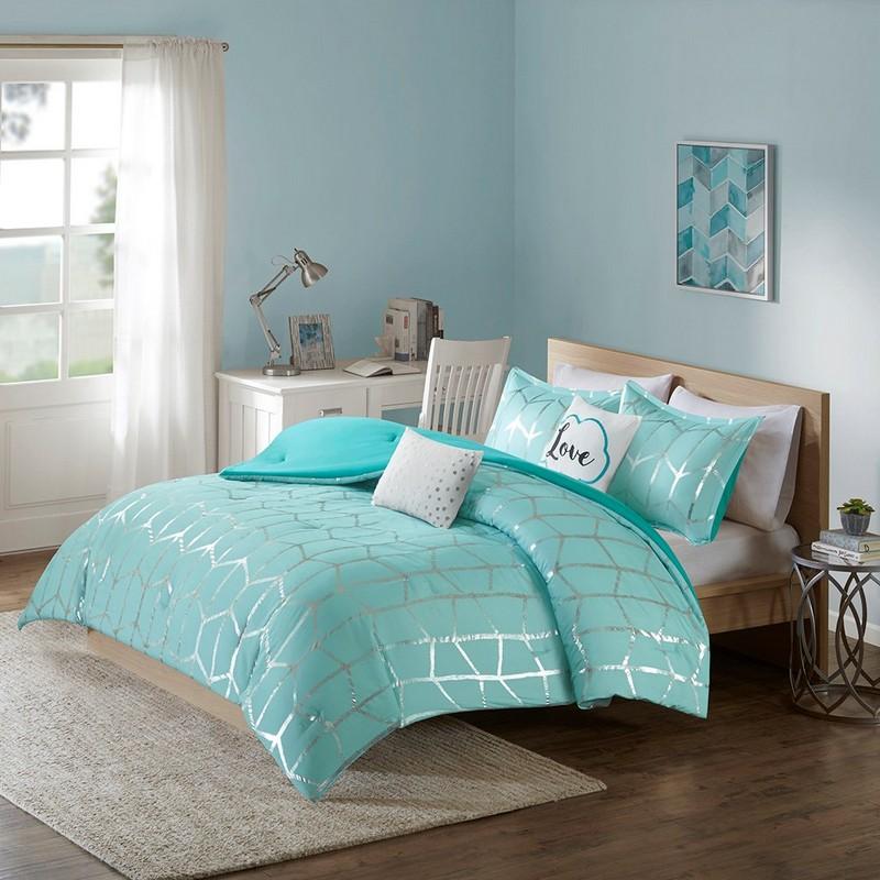 Freshen up your bedroom with the enchanting style of Intelligent Design's Raina Comforter Set. The stunning comforter flaunts a geometric, metallic silver print against a vibrant aqua ground for a fun and eye-catching look! Matching sham(s) echo the design seen on top of the bed to pull the entire ensemble together. Two embroidered decorative pillows with typography and metallic, complete this fabulous comforter set.