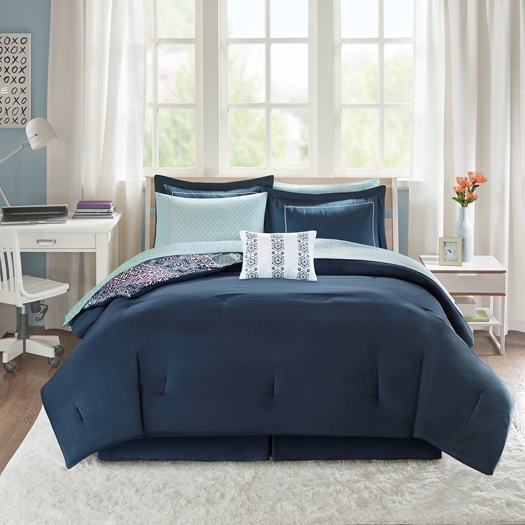Bright and casual, the Intelligent Design Loretta Complete Bed and Sheet Set will adorn your bedroom in stunning colors. A large medallion pattern runs down the center of the comforter, in vivid hues of navy and purple, with subtle bohemian details highlighted in white. A complete sheet set reiterates the bohemian motif seen on the top of bed, while one decorative pillow with ruched and pieced detailing perfectly complements the ensemble. Coordinating sham(s) with an embroidered border and a solid navy bed skirt finishes the look. Strikingly beautiful, this complete bed and sheet set will make your space feel like home.