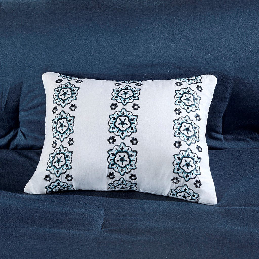 Bright and casual, the Intelligent Design Loretta Complete Bed and Sheet Set will adorn your bedroom in stunning colors. A large medallion pattern runs down the center of the comforter, in vivid hues of navy and purple, with subtle bohemian details highlighted in white. A complete sheet set reiterates the bohemian motif seen on the top of bed, while one decorative pillow with ruched and pieced detailing perfectly complements the ensemble. Coordinating sham(s) with an embroidered border and a solid navy bed skirt finishes the look. Strikingly beautiful, this complete bed and sheet set will make your space feel like home.