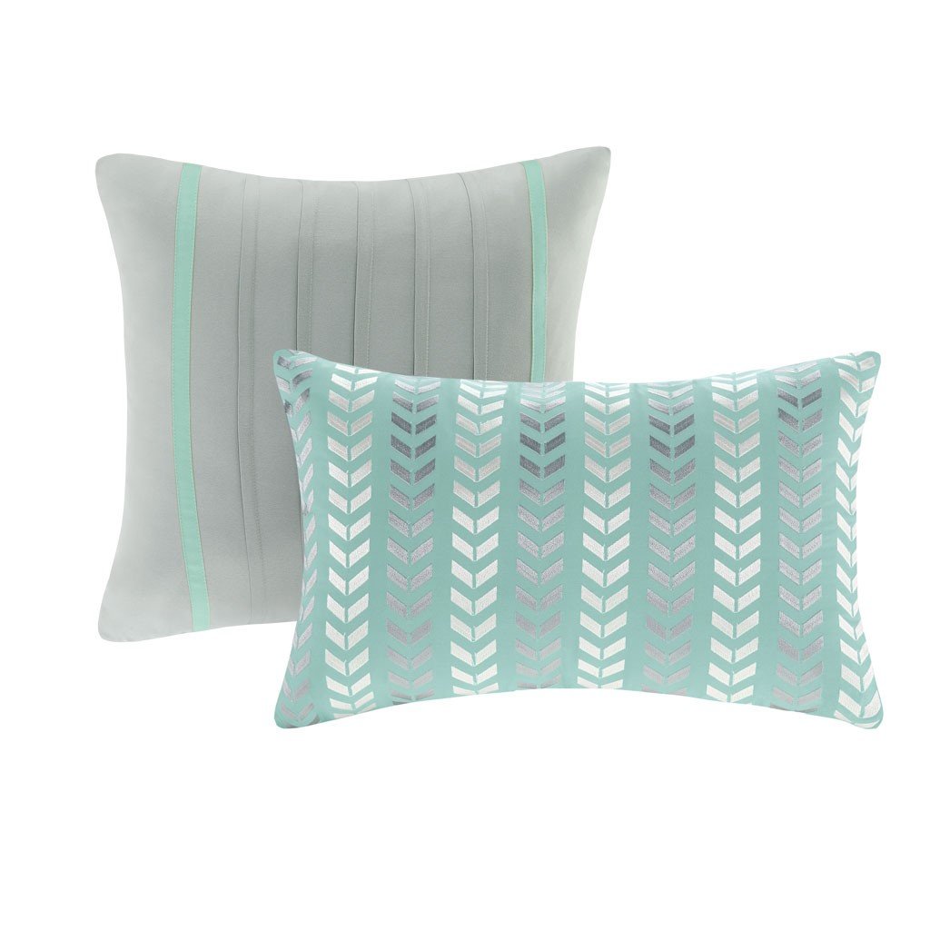 Nadia Makes Any Bedroom Fun And Inviting. The Comforter Features A Fresh Solid Teal Color With A Gray And White Chevron Print That Runs Along The Bottom Broken Up By White Vertical Stripes. The Shams Feature The Coordinating Gray And White Chevron Pattern With A Teal Flange. The Comforter And Sham Reverses To A Solid Gray Color. The Set Comes With Two Coordinating Teal And Gray Decorative Pillows.