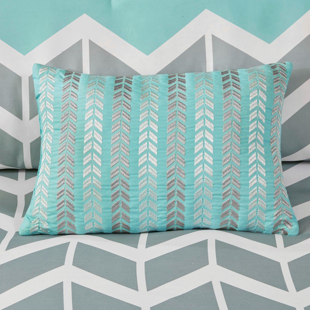 Nadia Makes Any Bedroom Fun And Inviting. The Comforter Features A Fresh Solid Teal Color With A Gray And White Chevron Print That Runs Along The Bottom Broken Up By White Vertical Stripes. The Shams Feature The Coordinating Gray And White Chevron Pattern With A Teal Flange. The Comforter And Sham Reverses To A Solid Gray Color. The Set Comes With Two Coordinating Teal And Gray Decorative Pillows.