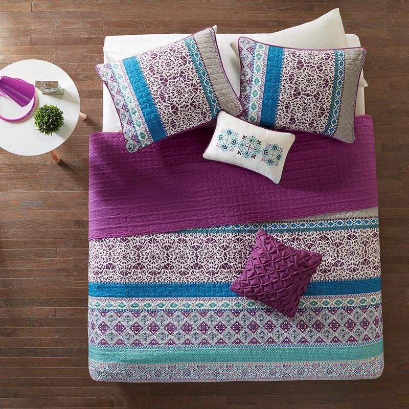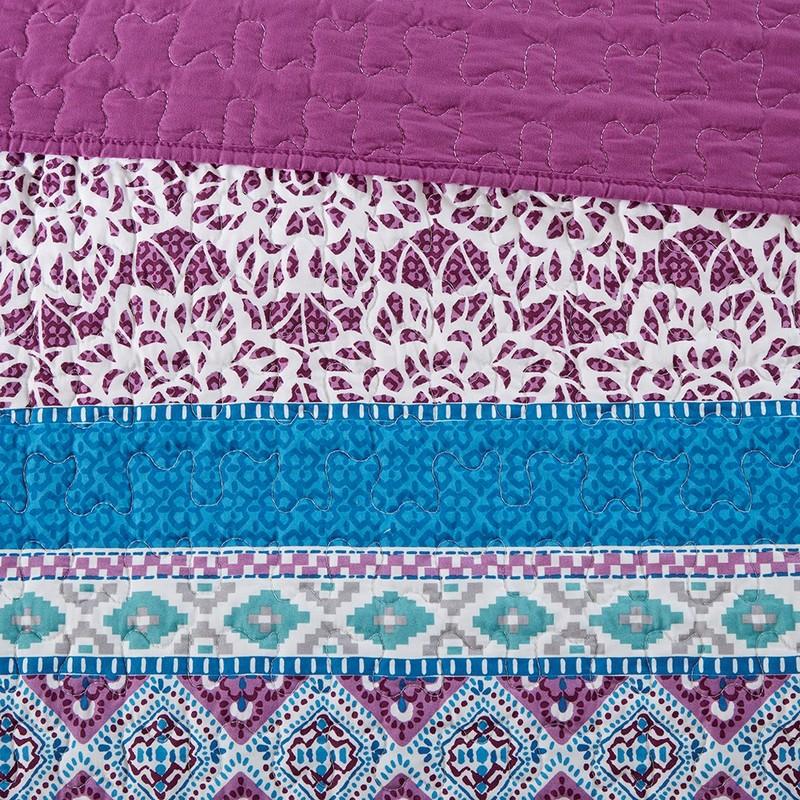 Give your bedroom a bohemian update with the Intelligent Design Joni 4 Piece Coverlet Set. Featuring gorgeous hues of purple, blue, turquoise and grey, this color combination enhances the intricacies of the global inspired pattern showcased throughout the Twin/Twin XL sized coverlet. A decorative pillow with embroidered medallions adds the finishing touch and brings the whole look together.