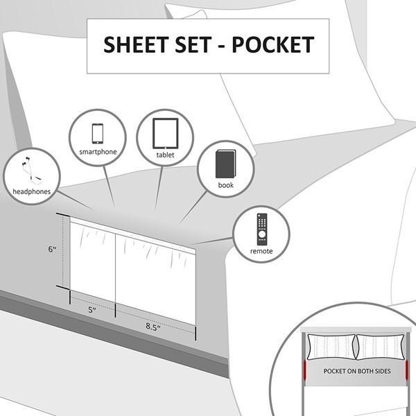 Reduce your bedside clutter with Intelligent Designs Microfiber 4 Piece Sheet Set with Side Storage Pockets. Naturally wrinkle-free, this sheet set features a fitted sheet with elastic side pockets that provide storage for your cell phone, books, television remote, and more. A bonus pillowcase is also included to complete the set. Made from ultra-soft microfiber, this sheet set is machine washable for easy care and pairs easily with any bedroom decor. Set includes: 1 flat sheet, 1 fitted sheet, and 2 pillowcases. The included fitted sheet fits mattresses up to 16-inches deep.