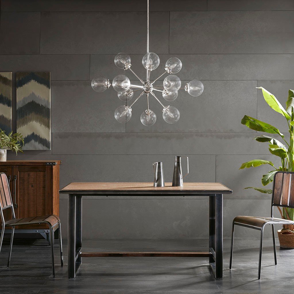 With its contemporary design, our Silver Paige Chandelier adds intrigue to any space. This metal and glass chandelier features a one-of-a-kind look, with twelve clear glass shades. A silver finish provides a sleek modern touch to any living and dining rooms. We suggest professional installation. Twelve Type-B light bulbs are needed.