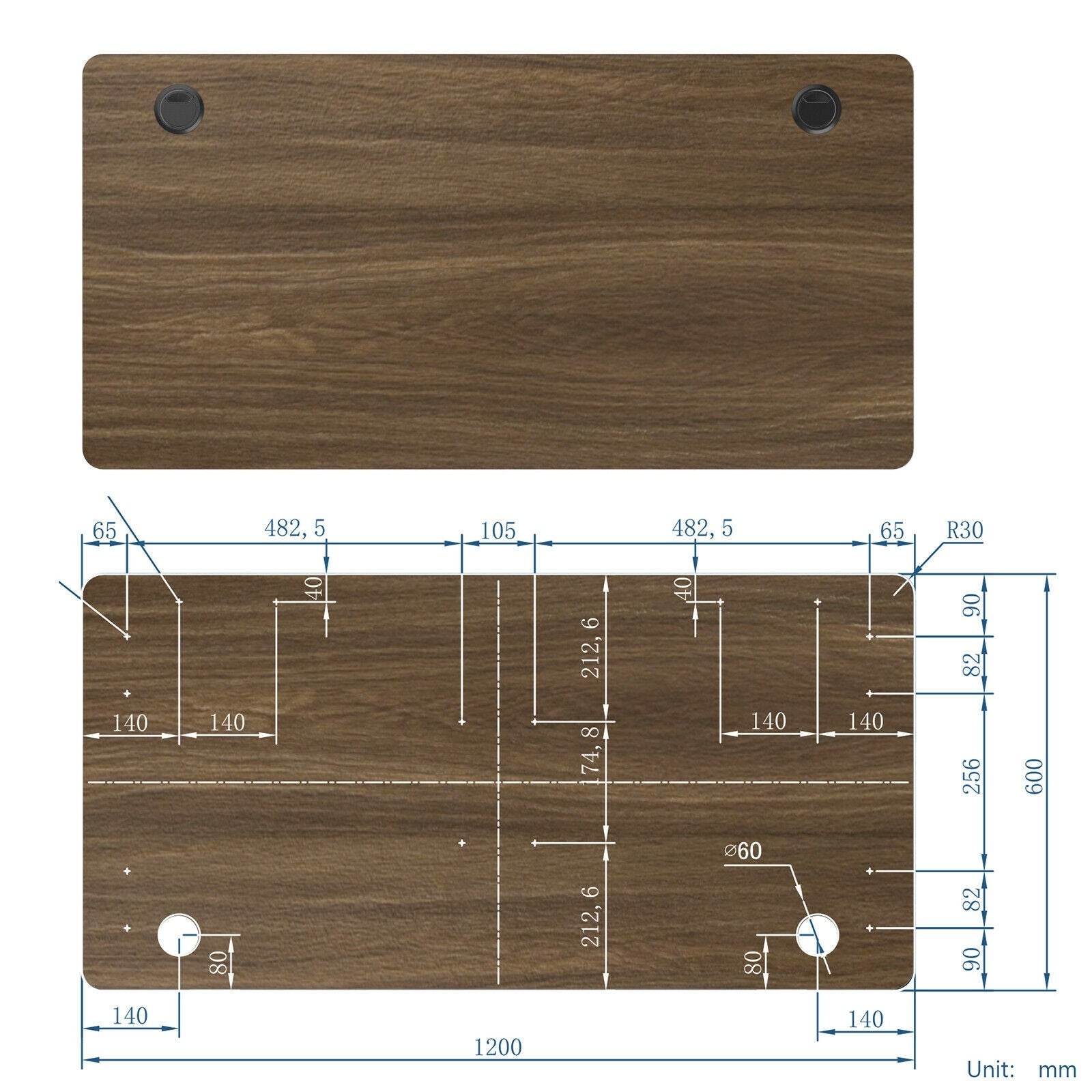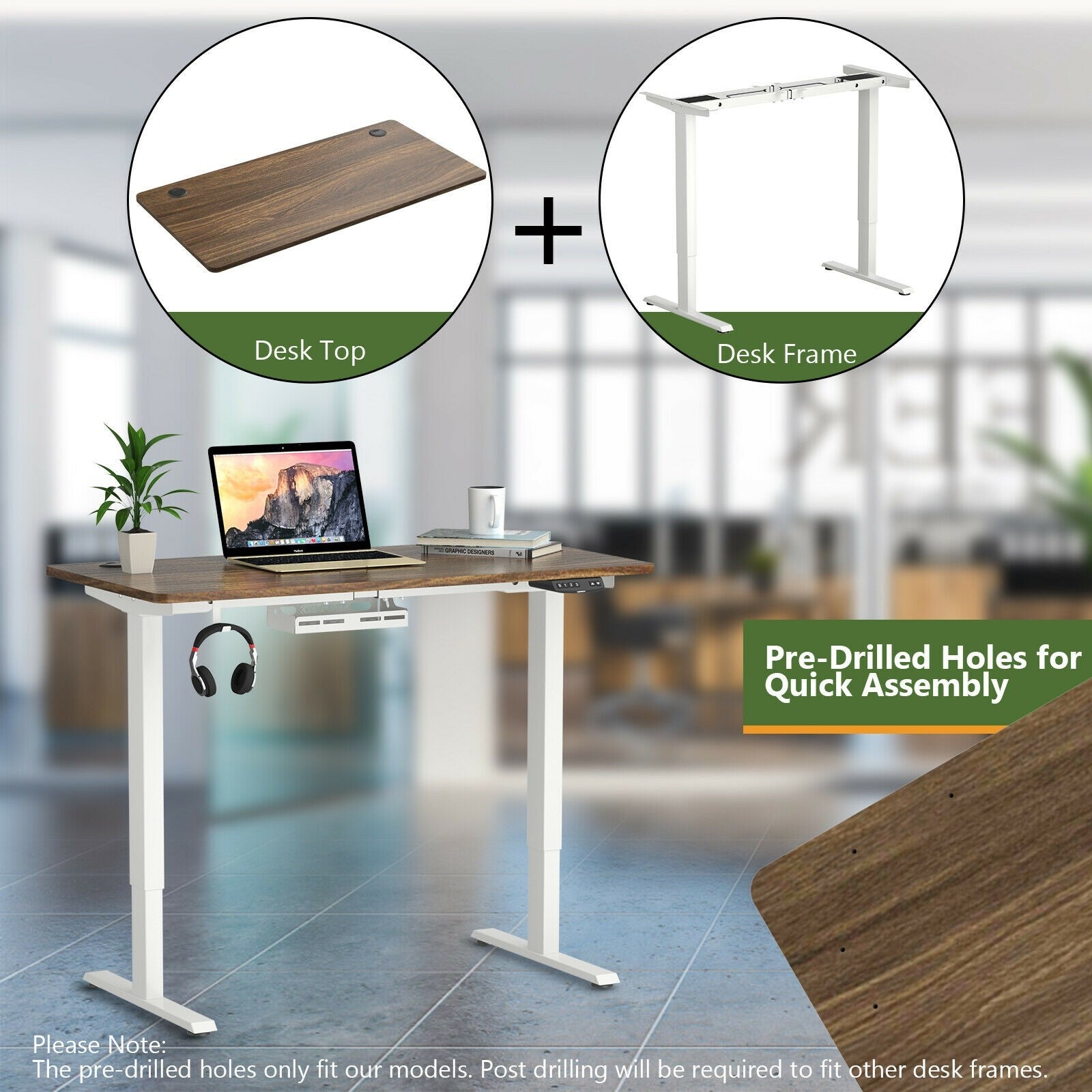 The one-piece desktop can be combined with the different base as you like to present you a fantastic desk. The large surface provides abundant room for working essentials keeping everything you need at hand and improving your working efficiency. Dual cable holes also make it suitable for 2 monitors and provide you with multi-task convenience. You can’t miss this multifunctional desktop! Please Note: The pre-drilled holes only fit the models. Post drilling will be required to fit other desk frames. Please prepare self-tapping screws whose length is less than 15mm(not included) to finish the assembly. If you are looking for a desktop like this do not hesitate to place an order and create your own workstation! Superior material and for solid structure and excellent durability A smooth surface allows you to clean it with a simple wipe Large working area to accommodate all you need and improve working efficiency Dual cable holes bring much more convenience Rounded corners prevent crash injuries for carefree use Pre-drilled holes make it more convenient for quick assembly Wide adaption to the standard frame sit-stand desk frame unsymmetrical frame etc.