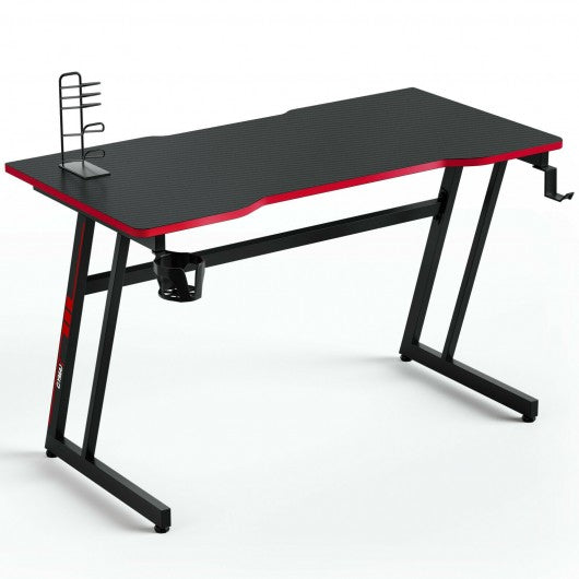 Equipped with a crossbar and Z-shaped structure the gaming desk has an excellent weight capacity of up to 220 pounds. Coming with a wide desktop the gaming desk allows you to put various items such as your computer keyboard decorations books etc. Meanwhile the desktop is made of MDF which effectively enhances overall durability and the carbon fiber surface is easy to clean. Besides this gaming desk comes with a headphone hook and a gaming handle rack that can store your things in an organized manner and a cup holder which allows you to place your favorite drinks. In general with a practical and wide desktop the gaming desk is suitable for plenty of occasions. With gaming style the gaming desk can help you create a gaming atmosphere. If you are looking for a cool and sturdy gaming desk like this do not hesitate to place an order! Durable carbon fiber desktop is waterproof and scratch-resistant Adjustable headphone hook allows you to get headphones within reach Gaming handle rack to store CDs or handles and keep desk neat Smooth surface is convenient to clean with a cloth Cup holder allows you to place your cups and drinks easily Simple design blends well in different décor styles Metal framework has outstanding performance in sturdiness Adjustable foot pads ensure the stability of computer desk Ergonomicdesktop provides you with a more comfortable gaming space Z-shaped structure greatly enhances overall stability with load-bearing capacity of up to 220 lbs Perfect for working gaming and studying