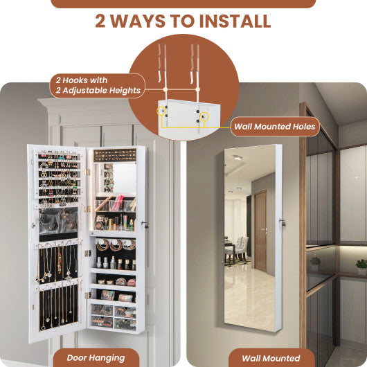 Embrace a beautiful life with this luxurious and functional jewelry armoire! Combining a full-length frameless mirror and large storage capacity this 2-in-1 mirrored jewelry cabinet is convenient for not only dressing up but also organizing all your jewelry and cosmetics including necklaces rings earrings bracelets sunglasses watches lipsticks etc. Besides the small mirror inside the cabinet with a bright 3-color LED light strip surrounded is designed for your convenience to make up and select jewelry. Moreover made of real glass both the 2 mirrors provide high-definition imaging without distortion. This jewelry armoire features a lock and 2 keys to keep children away from your jewelry and prevent the door from unwanted opening. You can easily hang the jewelry cabinet on the door with 2 hooks or secure it on the wall with included screws. All in all this mirrored jewelry armoire is an ideal gift for yourself your mother and lovers. If you are looking for such a product do not hesitate to take it to your home! Ample storage space to keep all your jewelry and other items in order 2 ways to install: wall-mounted and door hanging Lockable design with 2 keys to keep your jewelry well stored Full-length mirror gives a clear reflection from head to toe Equipped with a built-in small makeup mirror for convenient use Auto on/off bright LED light strip with 3 different colors Soft velvet lining protects your jewelry from scratching and wearing Solid MDF and premium glass ensure long-term use Recessed handle and smooth hinges for easy opening the door Space-saving and practical design for bedroom closet living room etc. Adhesive tape to prevent the cabinet from swaying Easy to install with pre-assembled cabinet body and detailed instruction
