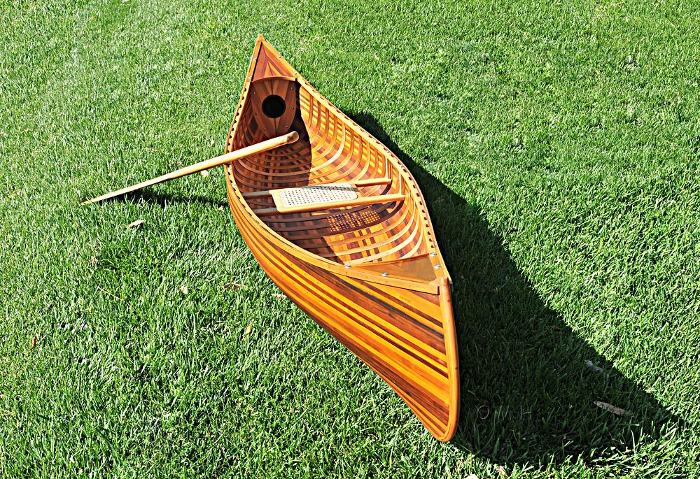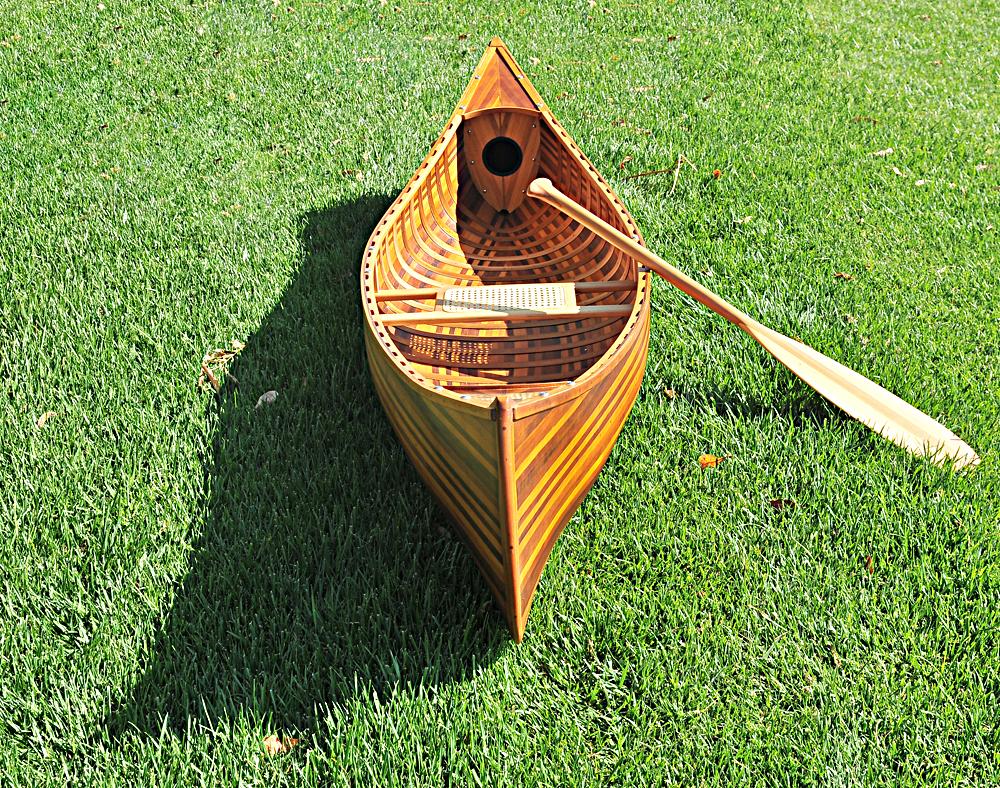 Same amazing handmade quality, but with a unique matte finish that adds extra depth and dimension to this particular canoe. A wonderful display piece, you will certainly admire the finish, the character of the Canadian red cedar and the attention to detail that went into making this boat. A true testament to the history of boat building, this piece is one that you can proudly show to all of your friends and family. Should you want a version to navigate through the water, we do have 12 and 18 foot canoes available that bespeak the same inherent quality and tradition. Features - Stunning beautiful clear graded cedar hull. - Fiberglass adds important tensile strength and abrasion resistance to the wood. - 100% western red cedar make our boats surprisingly light weight. - Ribs make our canoe stronger and prettier. - Paddle is included Boat Dim: L 118.5", W: 26.25", and bow height: 16". Mid Height:8 inches. Weight: 27lbs