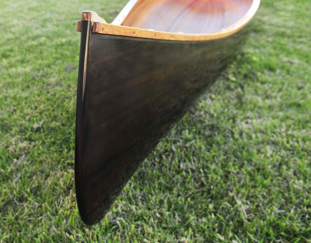 The dark stain is just the touch needed to take this particular piece to a whole new dimension. Imagine gliding along the water in this handcrafted vessel as you admire the beauty inherent to the wood and the richness afforded by the stain. A masterpiece indeed, this canoe contains the thought, care and craftsmanship that comes with 500 man hours. You are not simply riding along in a canoe, you are cascading across the plane of the water in a legacy of boat building and woodworking. We strive with this product to bring you only the best quality hand joined cedar strips along with a fiberglass resin that ensures durability and strength. This canoe has the following measurements: * Length 216 inches (18feet) * Width: 35 1/8 Inches * Mid Height: 11.5 Inches * Bow Height: 22.5 Inches * Width Beam: 35 1/8 Inches * Front Seat: 29.25 x 10 Inches, Rear Seat: 23.5 x 10.25 Inches * Paddles Size: 58.5 x 7 Inches * Rocker: Slightly Rocked * Weight: 70lbs * Capacity: 750lbs Features - Stunning beautiful dark stained graded cedar hull - Fiberglass adds important tensile strength and abrasion resistance to the wood - 100% western red cedar make our boats surprisingly light weight that one person can carry - Designed for a wide ranges of uses, comfortable with both day trip and long journey. -Great for both beginners and intermediate paddlers. - Come with a show graded set of wooden paddles.