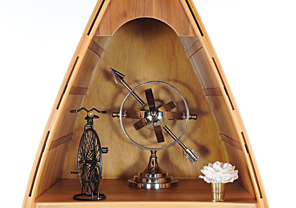 For the boat lover and wine connoisseur this piece is certainly a stunner! Whether housed in your dining room, kitchen or living room, it will make an amazing accent that will be the center of attention. As it is handcrafted just as our traditional water vessels, you get to admire the workmanship and the pride in detail and design. Hand joined strips of cedar effect an overall gorgeous and rich piece that is meant to be around for many years to come. Middle Shelf DIM: Depth: 11, W: 23.5 inches.