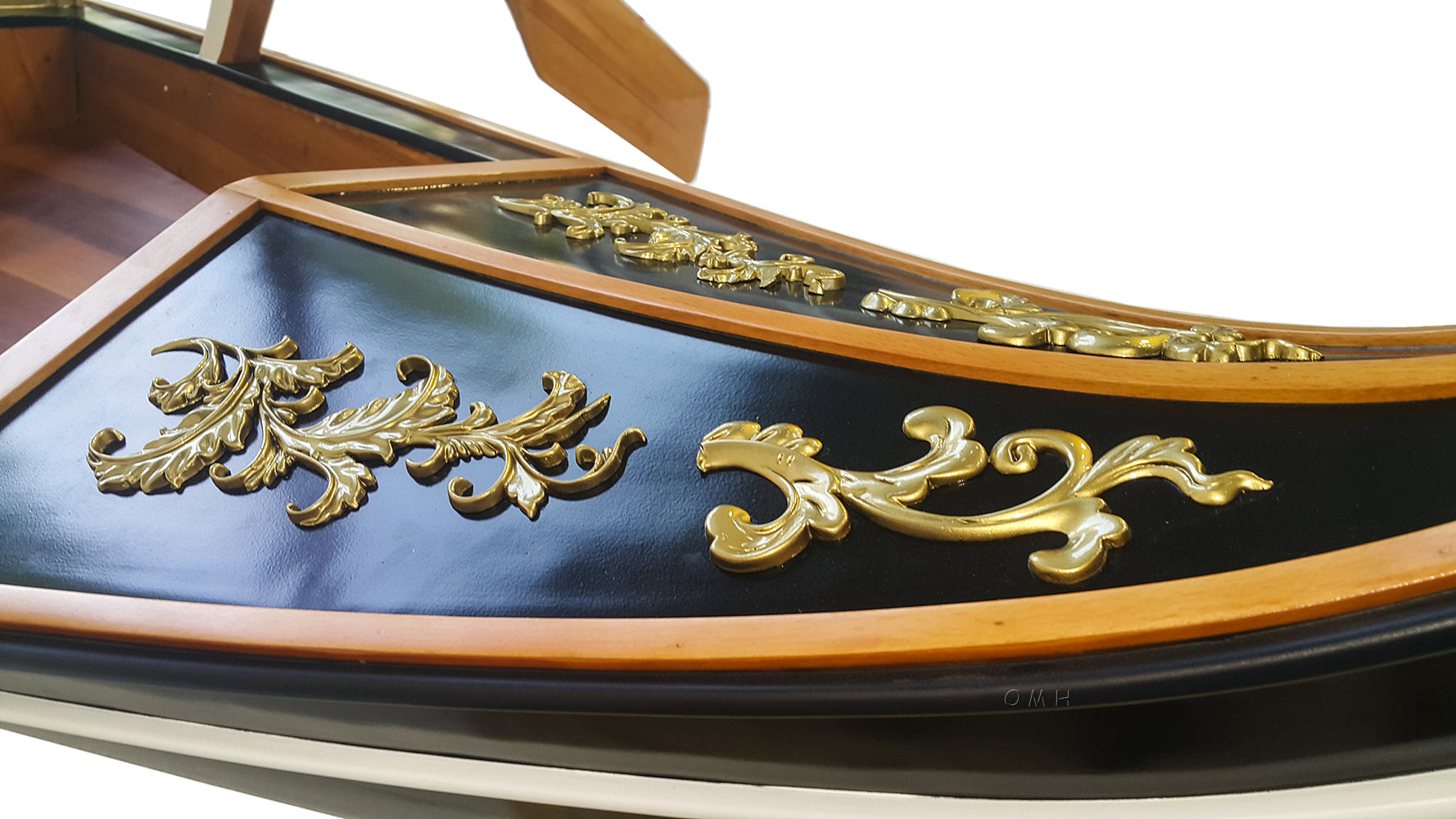 This is the REAL version of the Venetian Gondola. Fully functional at 14-feet long and beautifully painted in its original color black with white stripe. We also have a 24 and 36 feet long gondola available, upon request. This boat was completely handcrafted and takes about 600-800 hours to build. We still use the traditional method of constructions while integrating the highest quality of materials currently available. Strips of red cedars are joined together by hand and then encapsulated in fiberglass bonded in place with epoxy resin then coated with marine vanish. This combination of fiberglass and epoxy is very strong and the wood will be protected for generations. Important Note: Please be aware that this gondola is a SPECIAL ORDER item which means right after you have placed the order, it will take about 30-60 days for us to build and ship it to you.