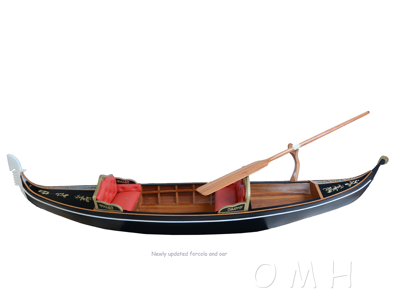 The most famous and characteristic symbol of Venice is the Gondola. This boat represents a typical Venetian Gondola circa 1882. The gondola is a traditional, flat-bottomed Venetian rowing boat, well suited to the conditions of the Venetian lagoon. For centuries gondolas were the chief means of transportation and most common watercraft within Venice. In modern times the iconic boats still have a role in public transport in the city, serving as traghetti (ferries) over the Grand Canal. They are also used in special regattas (rowing races) held amongst gondoliers. The gondola is propelled like punting, except an oar is used instead of a pole. The model now is rebuilt without the roof in the middle of the boat and used to carry tourists along the Venice River in Italy.