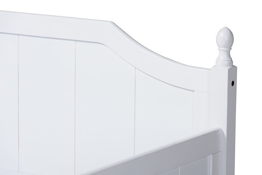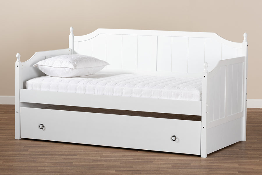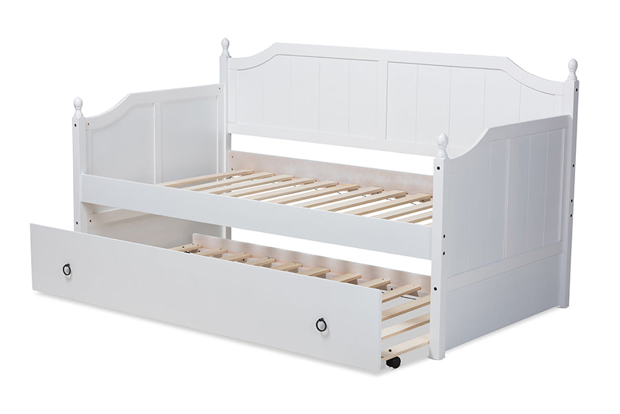 Naps and reading marathons abound with the cozy Millie daybed. This versatile piece is fitted with a pull-out trundle to provide convenient accommodation for overnight guests. Its sturdy wood construction ensures durability, while its classic white finish makes it easy to coordinate with any existing color palette. Inspired by farmhouse design, the Millie features charming cut-out panels enhanced by inset detailing and topped with elegant finial posts. Black metal ring pulls complete the look. The Millie daybed is made in Malaysia and requires assembly.