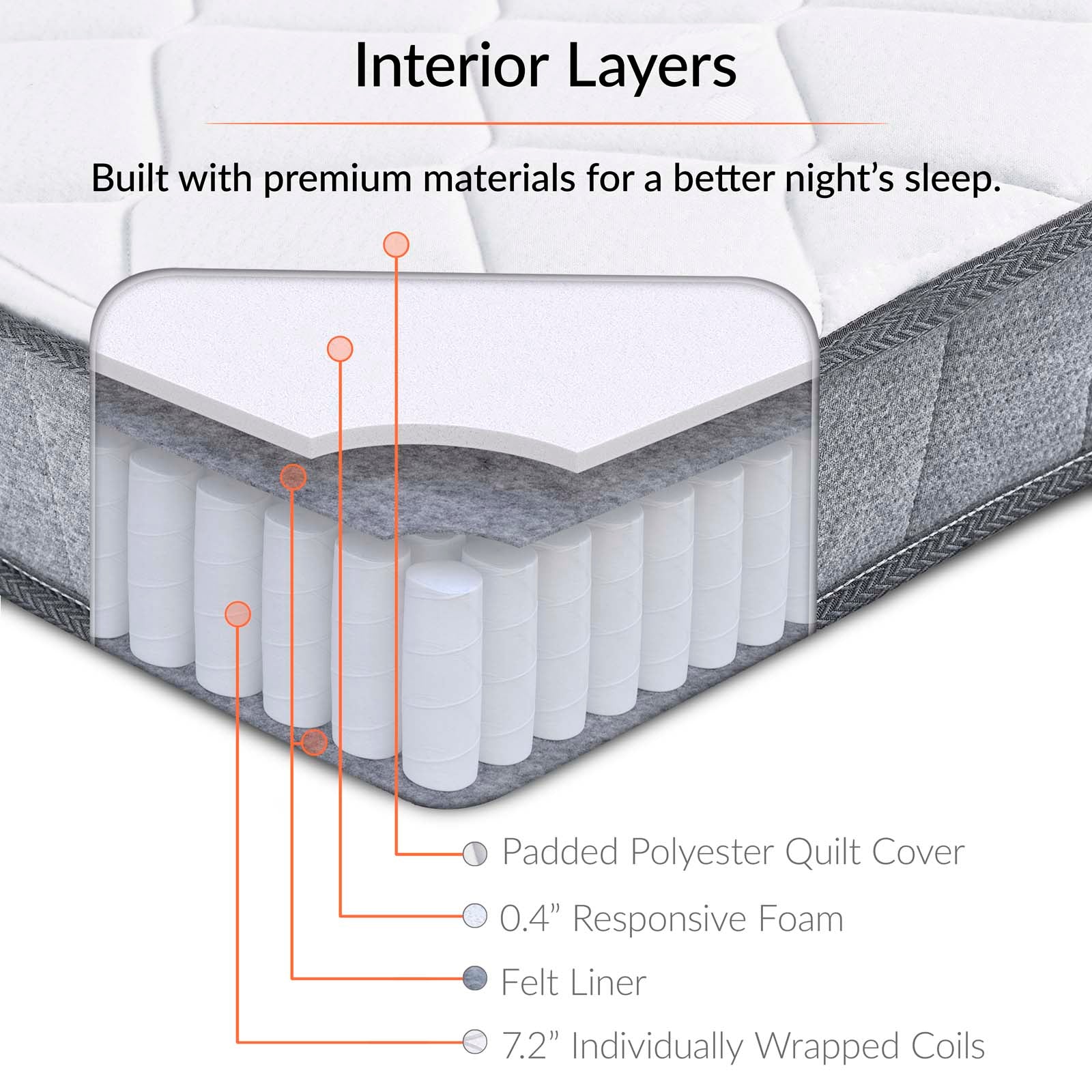 Enjoy sound sleep with the Kate 8� Innerspring Mattress. Limit bounce and absorb motion disturbance between partners with 7.2� tall individually wrapped coils without the sink and sag of foam and air mattresses. This feature is perfect for enabling partners with unique schedules and habits to sleep comfortably while reducing pressure on hips, back and shoulders. Complete with a gray fabric fire-resistant barrier that has been tested to ensure it meets safety standards, Kate comes with a padded quilt fabric top and felt liners for a smooth and even feel. Kate ships conveniently compressed and rolled in a portable box for easy delivery and fun-to-watch setup. Experience the firm yet cushioning support night after night with the Kate Innerspring Mattress. Set Includes: One - Kate 8" King Mattress