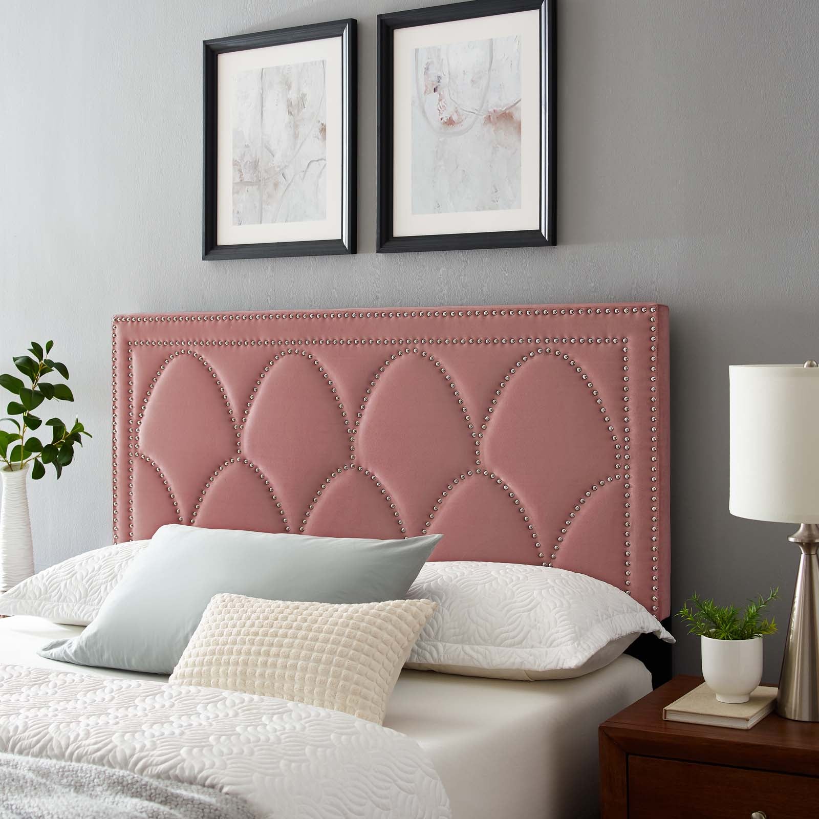 Bring modern elegance and glam deco style to your master bedroom or guest bedroom with the Greta Performance Velvet King/California King Headboard. Rich in velvety texture and vintage charm, this king / Cali king size headboard features classic nailhead detail that forms a beautiful scale pattern and double trim. Upholstered in stain-resistant performance velvet, this foam padded headboard offers supportive comfort while sitting up in bed relaxing, reading, or watching TV. A beautiful backdrop for a variety of bedding styles, this adjustable headboard fits king or California king bed frames with its three mounting positions. Assembly required. Set Includes: One - Greta King/California King Headboard